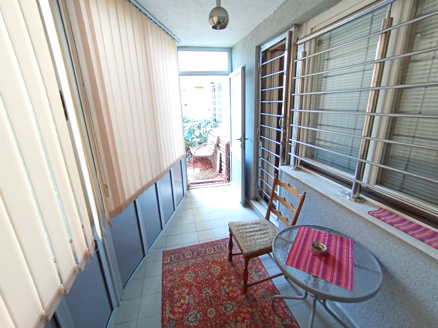 Stan se nalazi na prizemlju stambene zgrade. Pod je kombinacija parketa i pločica. Unutrašnja i vanjska stolarija je drvena. Stan gleda na obje strane zgrade. Dok s jedne strane ima ustakljeni balkon sa izlazom u privatni vrt, s druge strane je odignut zbog ulaza u garažu.
